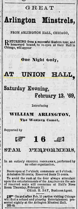 As early as 1866, M. George Pearson of Chicago gave a lecture on “Popular Ballad Music of the Olden Time.” Ahh yes, Aerosmith’s ‘Dream On’ is still 107 years away. Tickets for Hall’s Boston Concert on March 23, 1869 could be had for .50 cents, reserved seats went for .75 cents. The concert was promoted by Hall’s News Room. At minimum, George D. B. Hall could collect $300 to pay for advertising, performers fees and hall rental.
